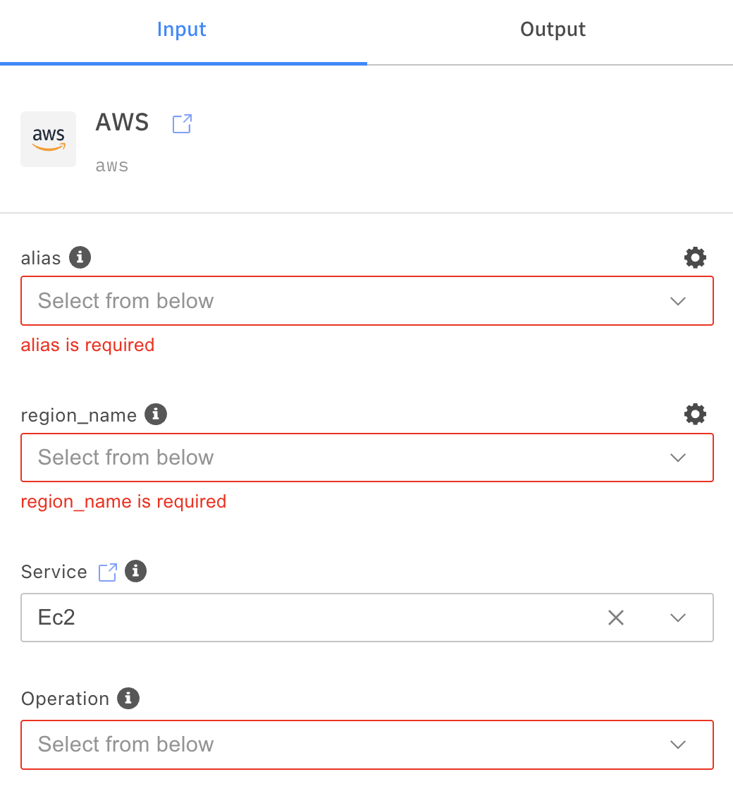 • Right Panel – An action configuration panel where you select the integration instance, account, and operation, enter the input parameters, and explore the output of your chosen action.